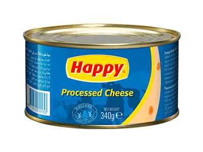 Happy Processed Cheese est un fromage fondu naturel à 45 % M.G.e.m.s. en boîte. Il est disponible en boîte de 340 grammes. Il est parfait pour garnir un sandwich ou un en-cas.